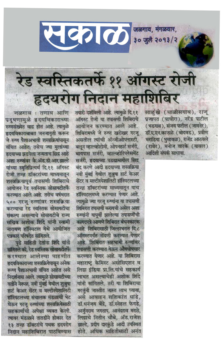 Organized Free heart Check Up Camp By Red Swastik Society, Jalgaon Branch On 11th August 2013.