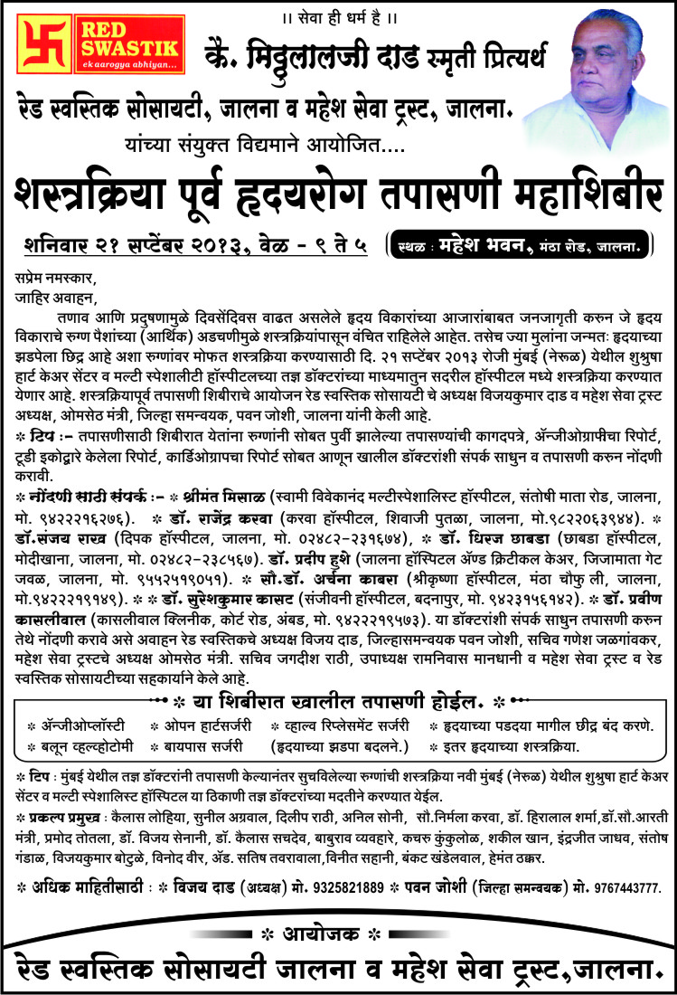 Organizing Free heart Check Up Camp By Red Swastik Society, Jalna Branch On 21st September 2013.